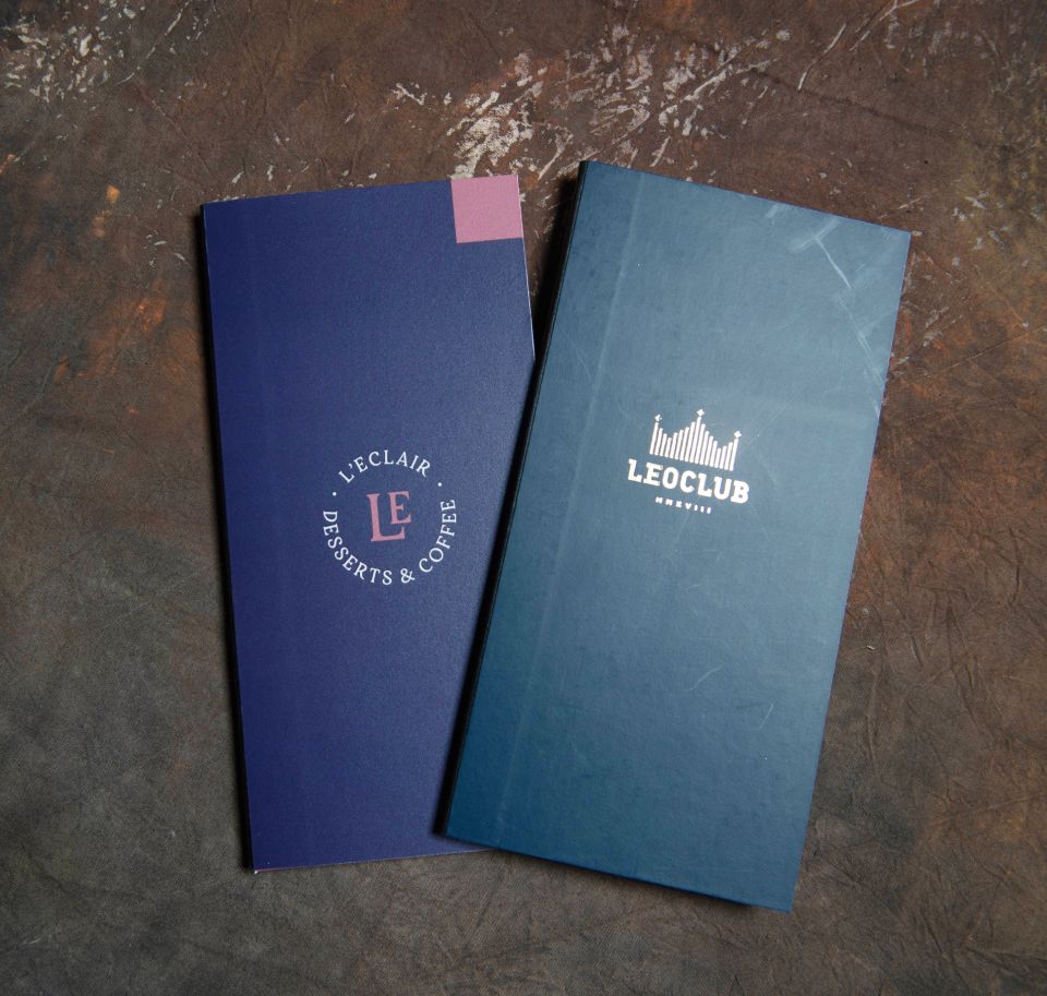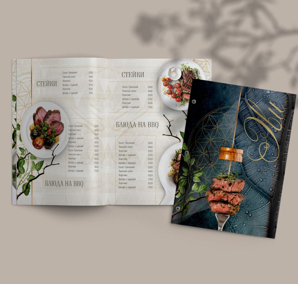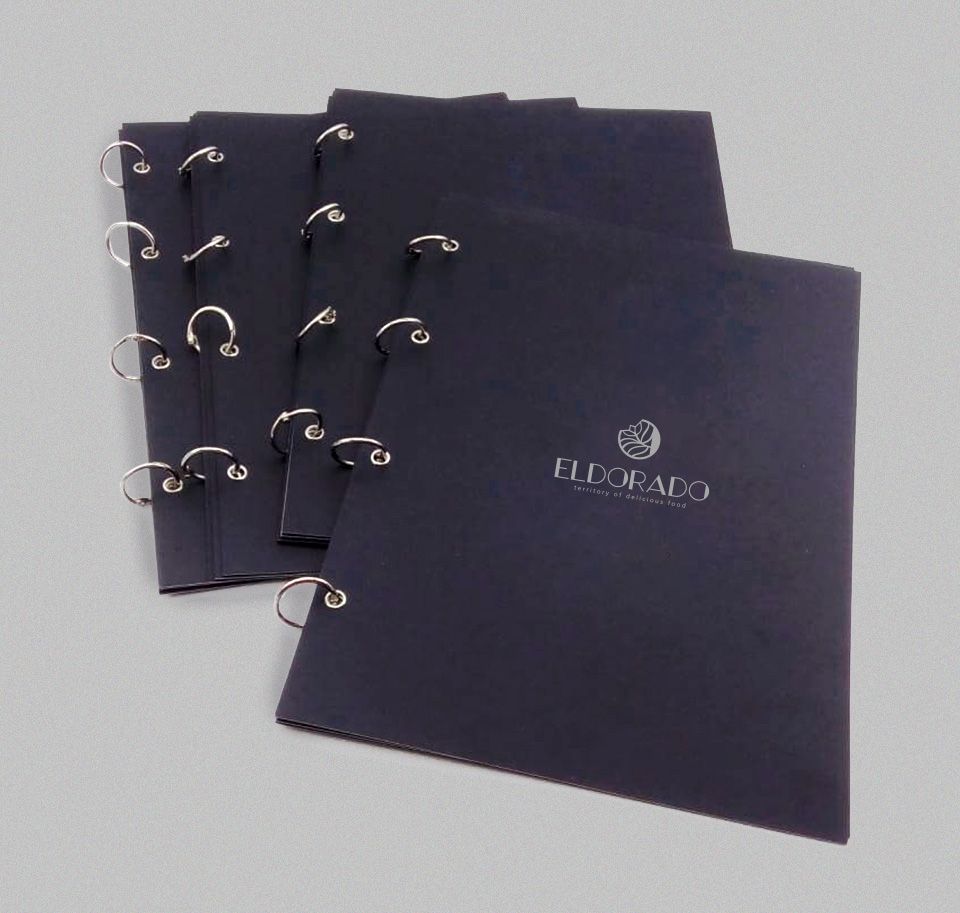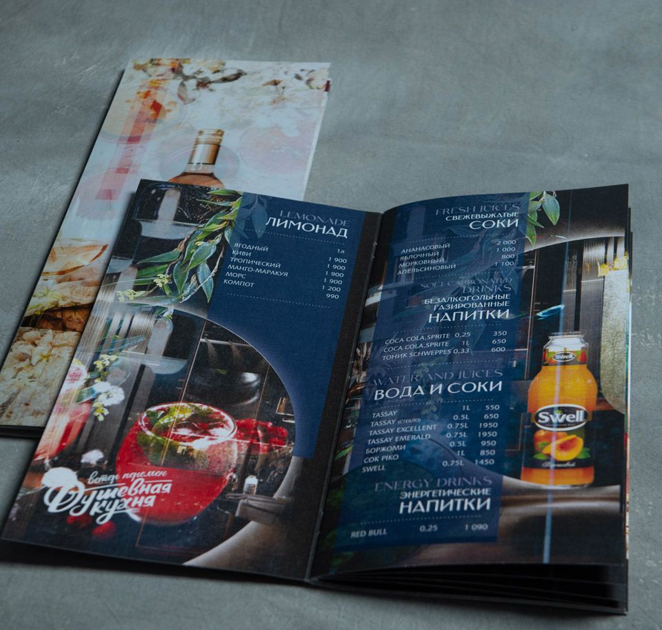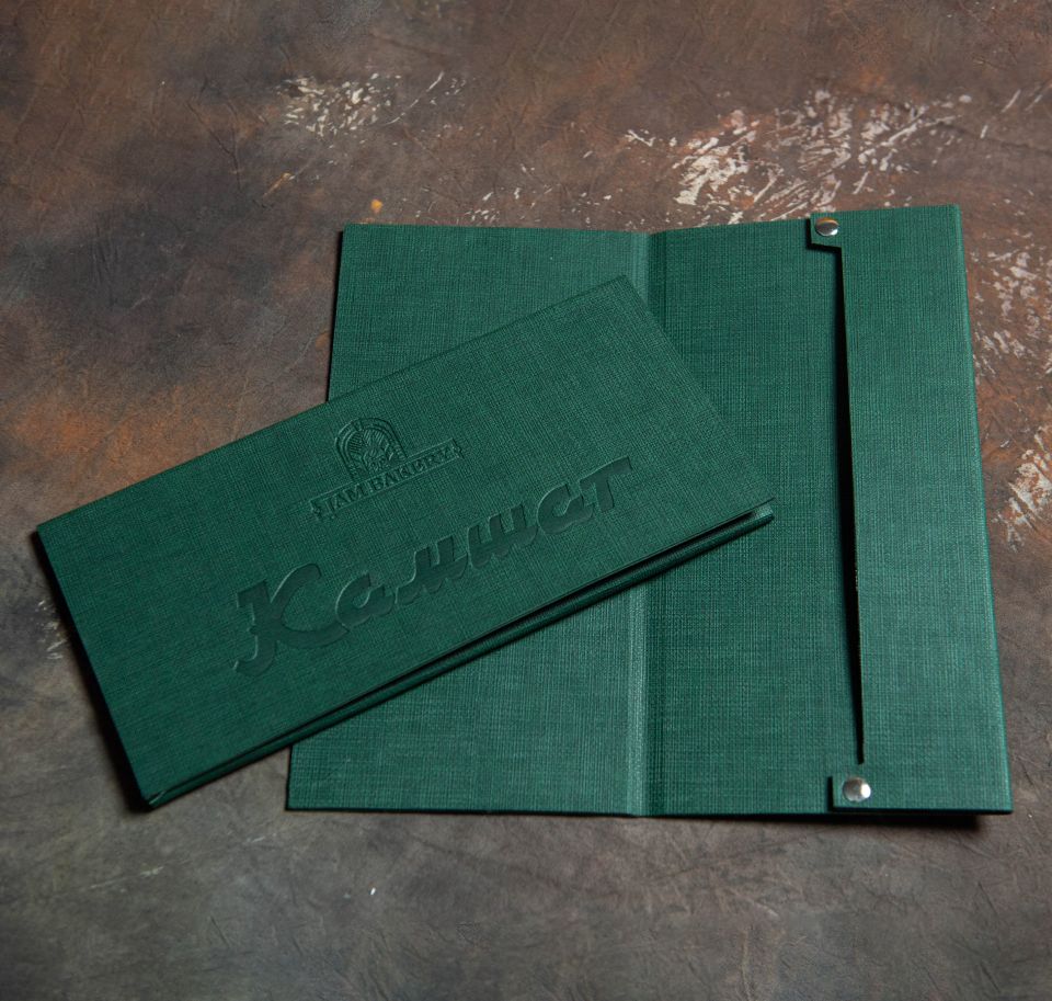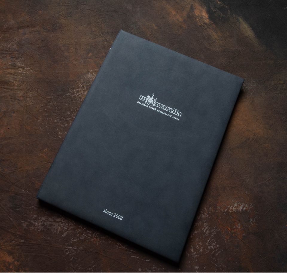 Это меню имеет десятки вариантов по цветовой гамме, тиснению золотом, серебром, бронзой, применением внутри различных бумаг, включая кальку и даже уф-печатью по поверхности винила.