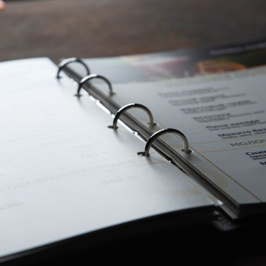 Удобный кольцевой механизм позволяет заменять листы, выборочно менять цены и позиции в меню, не неся лишних затрат.