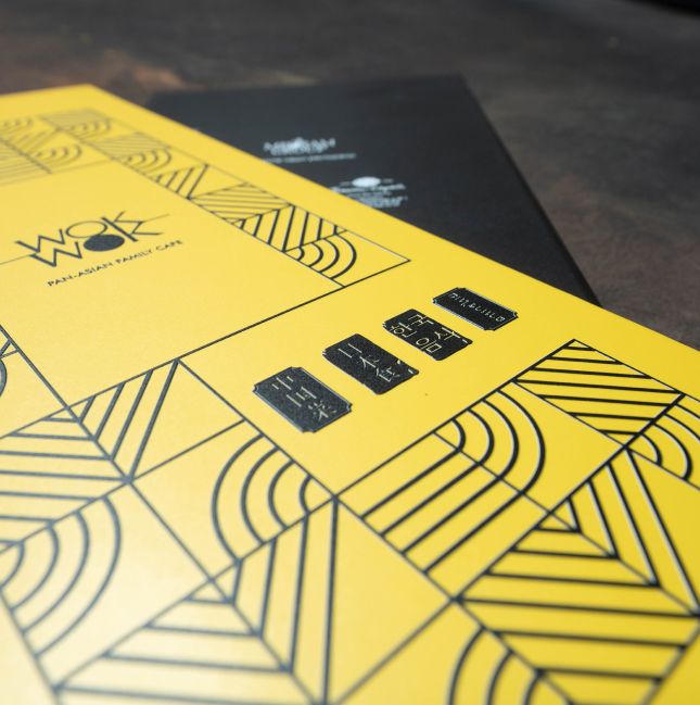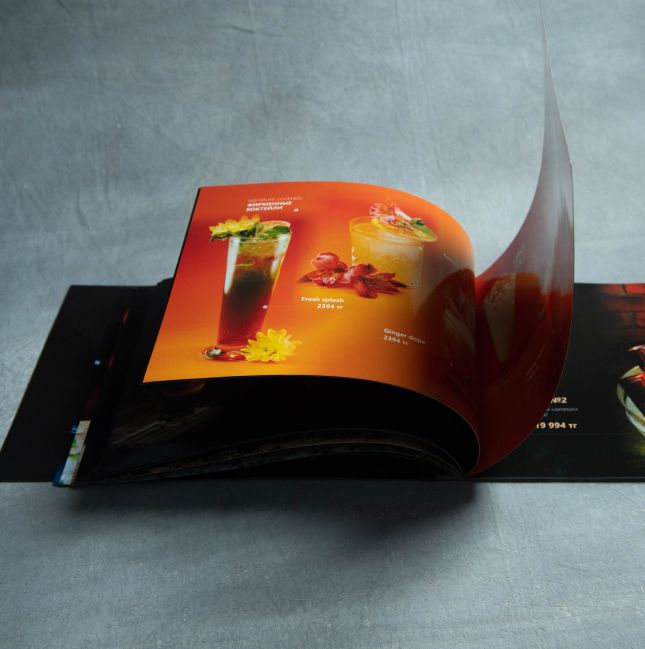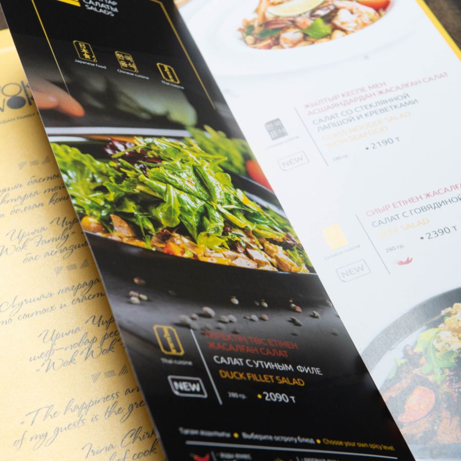 Это меню имеет десятки вариантов по цветовой гамме, тиснению золотом, серебром, бронзой, применением внутри различных бумаг, включая кальку и даже уф-печатью по поверхности винила.